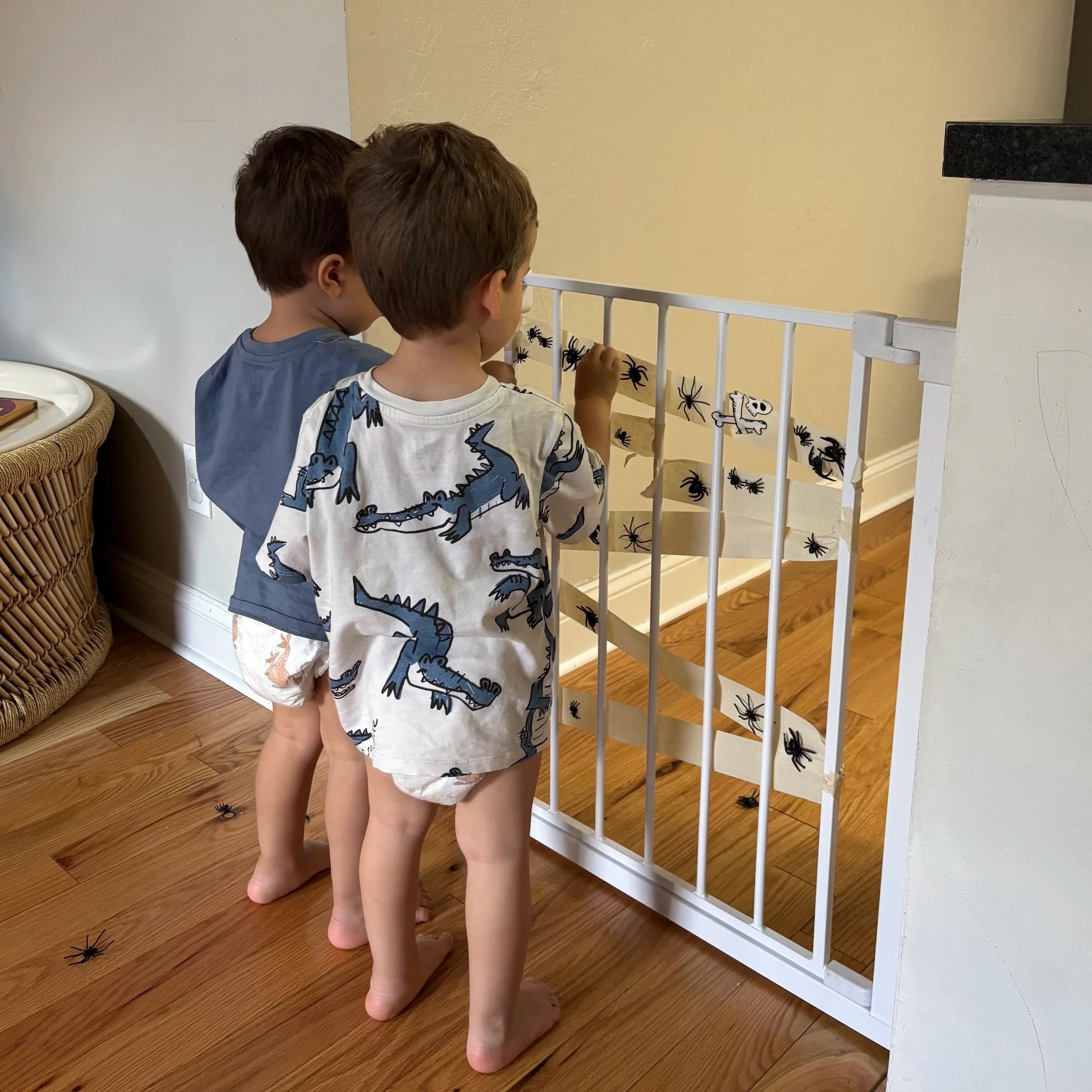 I grabbed some clear Scotch tape and a pack of plastic spiders and made a quick “web” on our child safety gate. I’ve tried this activity a couple of times recently, but this time it finally clicked!